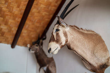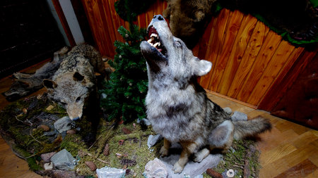 Stuffed elk deer wolf beaver boar hanging on the wall in the taxidermist's shop