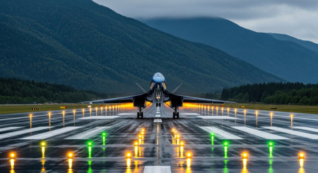 A futuristic supersonic jet aircraft on a wet airport runway at dusk, with illuminated yellow and green lights reflecting on the surface. Mountains and trees are visible in the background under a cloudy sky.