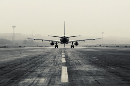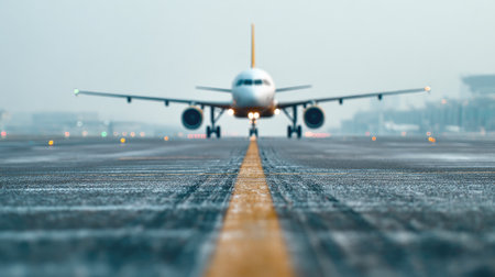 Majestic Commercial Airplane Ascending During Early Morning with Misty Dawn Light Reflecting on Runway