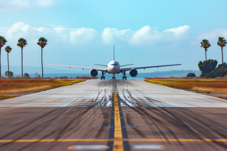 An airplane takes off from a runway, captured against a clear, blue sky. The composition showcases the plane centered, with the runway lines converging towards the horizon. The image features bright colors, suggesting a daytime scene. Suitable for commercial projects or editorial content related to aviation and travel.