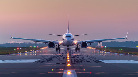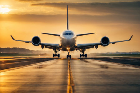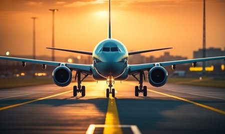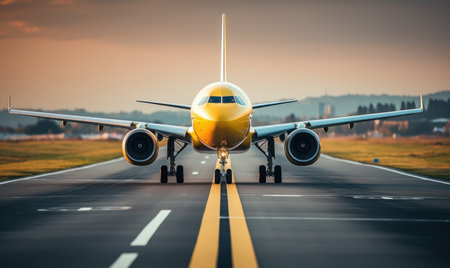 Airplane taking off at dusk, transporting passengers in the aerospace industry generated by artificial intelligence