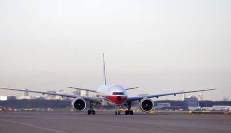 Traffic at the airport. Airplanes are taxiing to the runway for take off.