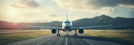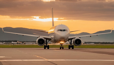 An aircraft taxis down the runway, ready for takeoff, with mountains in the background illuminated by the warm glow of a setting sun.