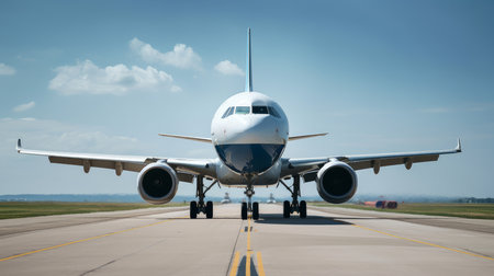 Jet plane on a blue sky background of a taxiway. Front view from eye to eye. Generative AI.