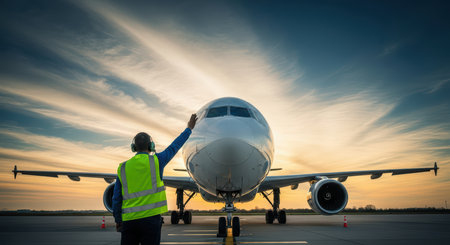 A ground crew worker in a high-visibility vest guides an airplane on the runway during daytime. Ensuring safe departure and arrival of aircraft, this image depicts essential airport logistics and aviation safety procedures. The professional worker's dedication is clear under the sunny sky.