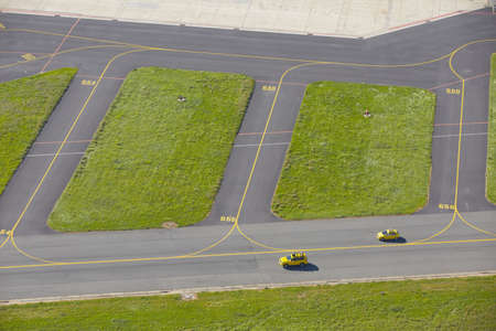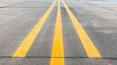 A captivating image showcasing the yellow lane markings on an airport runway, emphasizing the expansive pavement. Perfect for transportation themes or aviation projects.