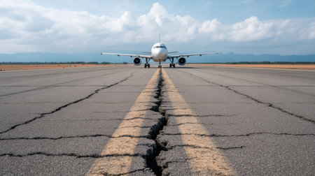 A solitary airplane sits on a cracked runway, highlighting challenges in aviation infrastructure against a backdrop of blue skies and distant mountains.