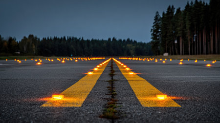 A serene nighttime view of an airport runway illuminated by soft lights, bordered by lush forest, highlighting the markings and creating an atmospheric vibe for aviation photography.