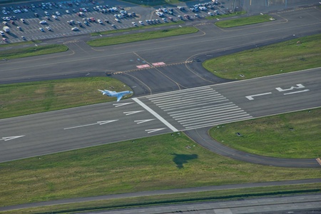 Vibrant Aerial View of a Busy Airport Runway with Detailed Markings and Surrounding Infrastructure