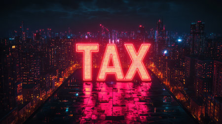 Vibrant city scene with large neon TAX sign illuminating the urban landscape at night.