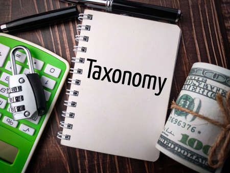 Taxes word on paper, reminder. Taxation concept, accounting and business