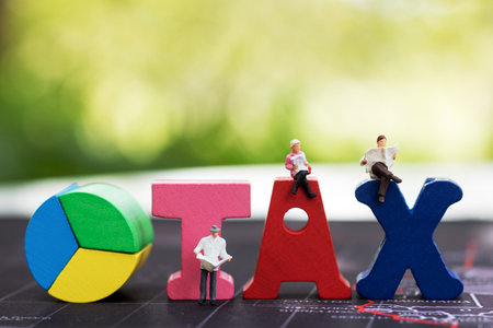 Miniature people siting on grid and blocks with the word TAX. The concept of wait to pay annual income (TAX) for the year.