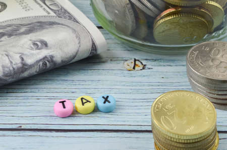 Money banknotes, coins and alphabet beads with word TAX