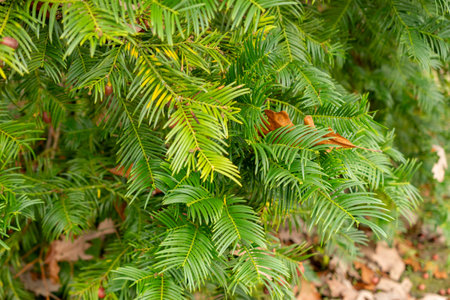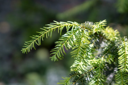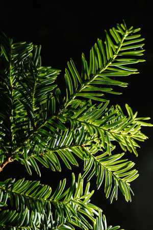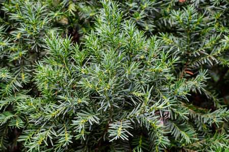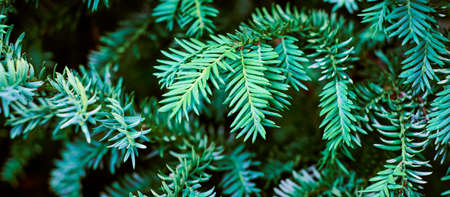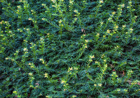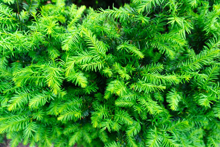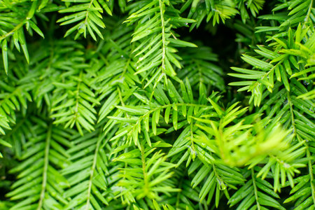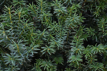 Evergreen tree close up. Yew tree. Green natural pattern. Taxus baccata texture.
