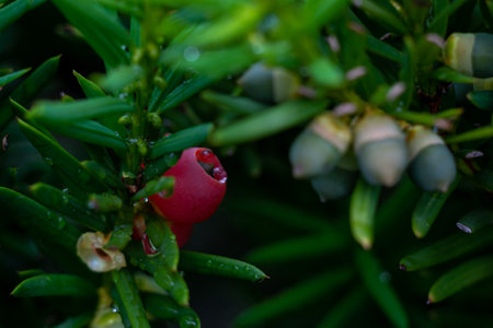 ripe and unripe fruits of berry yew on the branches of a bush after rain