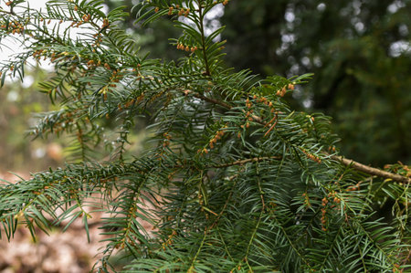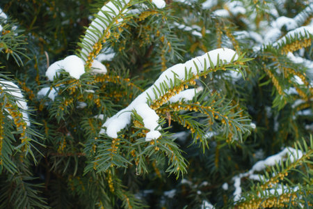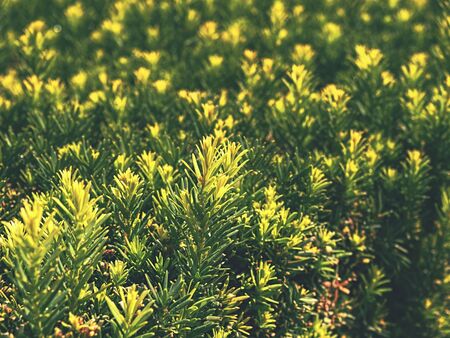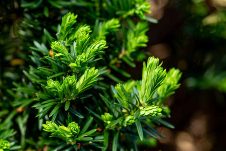 Taxus baccata ornamental shrub in bloom, coniferous branches with green needles and strong spring allergen in sunlight