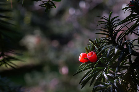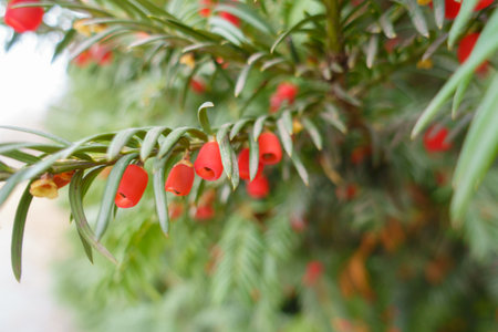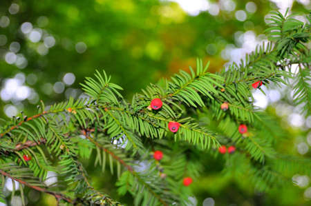 Beautiful red berry of yew tree during autumn. Natural parkland scenery.