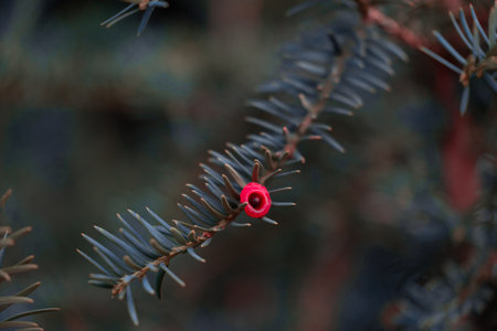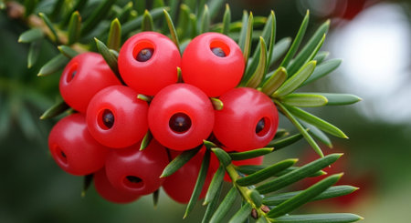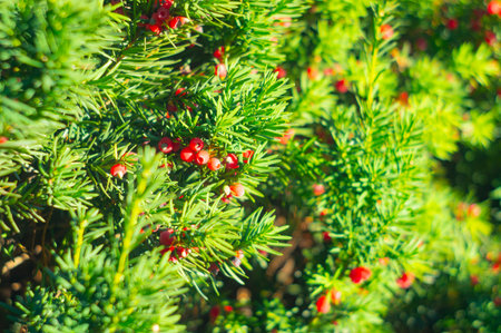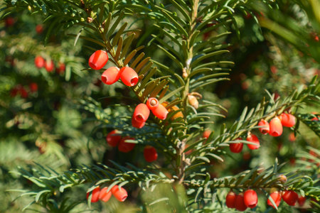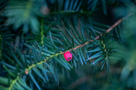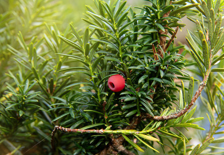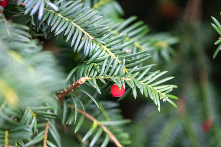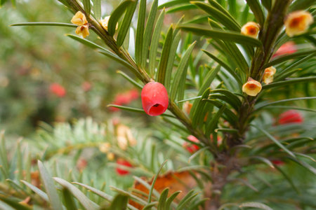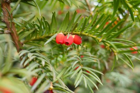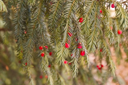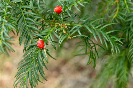Taxus baccata evergreen yew tree foliage close up. European yew tree with mature and immature red seed cones, poisonous plant with toxins alkaloids. beautiful evergreen tree branches background