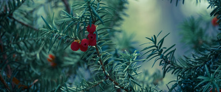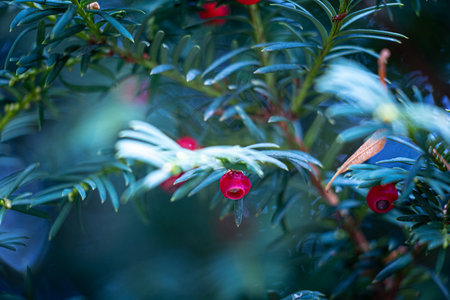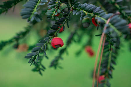 European yew tree, Taxus baccata evergreen yew close up. Toned green yew tree branch with mature and immature red seed cones. Poisonous plant with toxins alkaloids