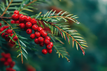Bright red berries dangle from lush green pine branches glistening with droplets of water in a serene natural setting.