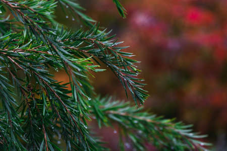 Close up of branches of juniper, spruces in the forest. background. Texture
