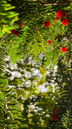 Red berries growing on evergreen yew tree in sunlight, European yew tree