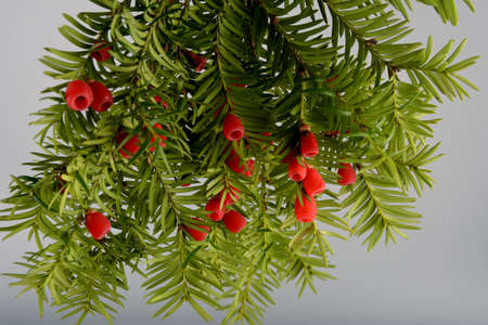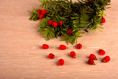 Taxus baccata European yew is conifer shrub with red ripened berry fruits. A branch of the berry yew on the table.