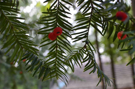 red berries on a tree branch in the garden. Taxus baccata or yew evergreen tree.