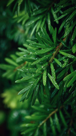 Yew in gentle light rain, soft raindrops visible on vivid green leaves, natural realistic style, bright fresh colors, balanced wide composition, cinematic framing, highly detailed.
