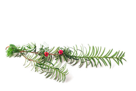 English yew or european yew green branches with red berry. background with green needles of a berry yew