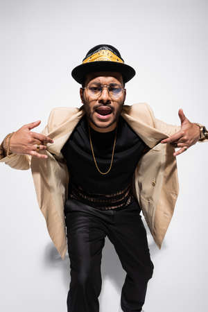 eastern hip hop performer in fedora hat and eyeglasses gesturing while singing on grey