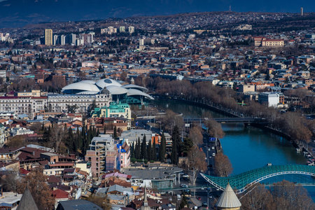 Georgia - Tbilisi. View to the most famous park and Peace bridge in Tbilisi, downtown in wintertime in sunny day. Mix of ancient and modern architecture of Old Tbilisi, capital city of Republic of Georgia in Caucasus region. 21.01.2018