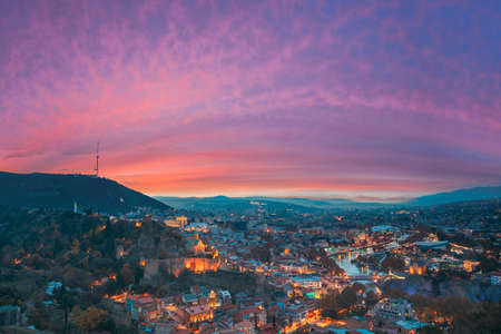 Tbilisi, Georgia. Elevated Rooftop View Of Georgian Capital City Skyline Cityscape In Evening Illuminations. Georgian Capital Skyline Cityscape. Famous Popular View. Altered Sunset Sky
