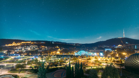 Tbilisi, Georgia. night dusk evening Top View Of Famous Landmarks In spring Evening dusk night. starry sky night sky above Georgian Capital Skyline Cityscape. altered stars sky