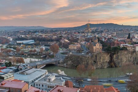 Beautiful view of Tbilisi at sunset, capital of Georgia. Citiyscape