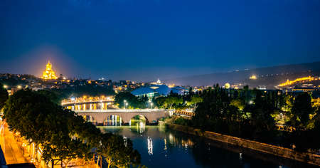 Scenic view of Mtkvari river and Holy Trinity Cathedral at night illuminated in Tbilisi Georgia