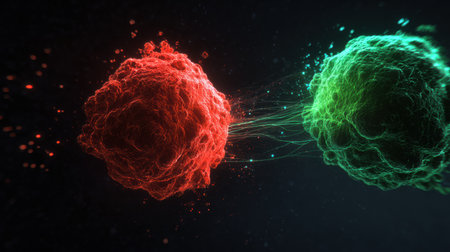 Vivid representation of cellular interaction featuring red and green elements with intricate details, creating a sense of movement and energy.