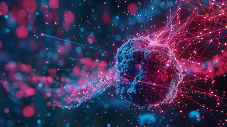 Visual representation of a cancer cell interacting with an energy surge, showcasing vibrant colors and dynamic movement. Concept of medical research, biotechnology, healthcare advancements.