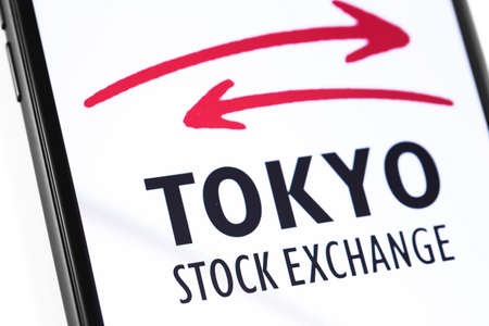 closeup smartphone with Tokyo stock exchange logo on the screen. Moscow, Russia - March 17, 2019