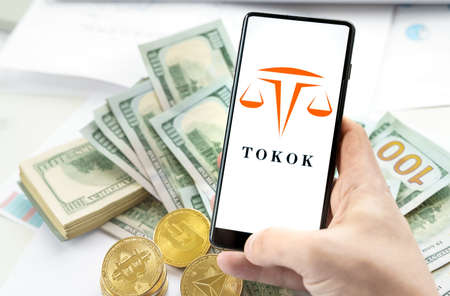 Russia Moscow 20.05.2021 Tokok logo in mobile phone.Cryptocurrency decentralized exchange DEX.Trading blockchain platform.Swap,buy,sell crypto token,digital coin Bitcoin,Ethereum.Business,invest.