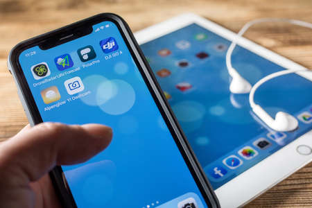 KATOWICE, POLAND - FEBRUARY 24, 2020: IPhone XS screen with application icons. Polish version.