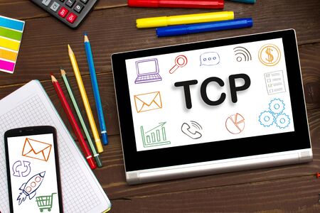 TCP Transmission Control Protocol the inscription on the touch-screen tablet on the table of a businessman