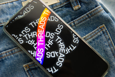 Tver, Russia - July 15, 2023, the threads logo on the smartphone screen lying on the jeans. The threads icon. The logo of the current application. Threads social network.