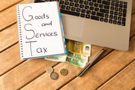 Good service and tax . Laptop, pen, coins, banknotes on wood background .