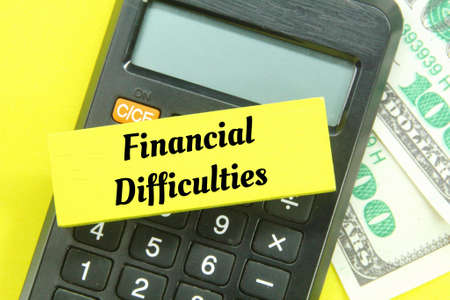 calculators, banknotes and colored boards with the words financial difficulties