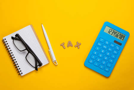Calculator with the word tax and notebook with glasses on yellow background.