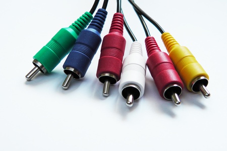 Several cables with RCA connectors for audio and video on white background.