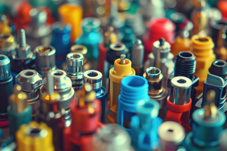 A close-up shot of a colorful array of electrical connectors, showcasing their designs and details against a blurred background of other components. --ar 3:2 --v 6 Job ID: 39ac4739-cf00-44bf-9ea9-a3e0a0ceb323
