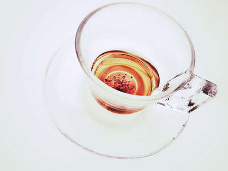 Top view close up picture of glass teacup with biscuits isolated on white background, frontfocus, shallow depth of field
