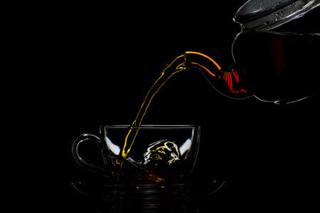 Tea in a transparent teapot on a black background, studio light